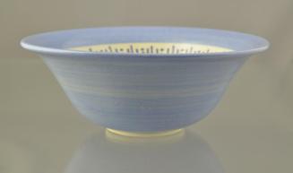 DescriptionCircular bowl has slightly flared sides and a slightly flared rim. Interior sides of the well are decorated with a series of long and short lines in blues and black, radiating from the centre (stitch pattern), bottom of the well has blue beach glass. Exterior sides and inner rim are blue with an overall tranparent glaze.Status