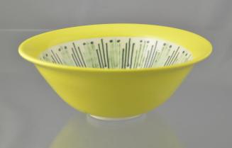 DescriptionCircular bowl has slightly flared sides with a slightly flared rim; series of decorative parallel green lines and raised lines with dots (stitch pattern) around interior; green beach glass melted in bottom of well; bright yellow on exterior sides and inner rim with transparent glaze overall;Status