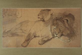 Descriptiona lioness is lying on her side with her head & shoulders raised, behind her to the right of the picture is a lion whose body is vaguely defined, his head leans against the lionesses left shoulderStatus