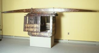 DescriptionPalanquin is made of wood and is lacquered with dark amber nashiji ground. It is decorated with gold crests of the Tokugawa family and with bamboo in gold, green, bronze and brown maki-e lacquer.The edges are trimmed with decorative brass ornaments. The pole is decorated with the Tokugawa mon or family crest and the trailing leaf design. There is a barred window on the front side and in each of the sliding doors at the sides. On the ceiling is brown lacquered wood with gold leaf, on the side walls and front wall are painted textile panels of spring flowers beside a river, and on the back painted panel are cranes nesting in an old pine tree. (Palanquins, such as this one, were used by feudal lords called daimyo during the Edo period.)
