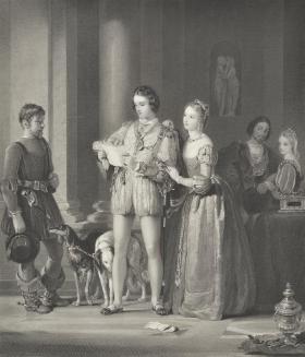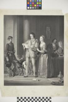 DescriptionA young man has just received a message & is reading it while a young lady rests her hands on his arm & shoulder. Two dogs stand between the young man & the messanger. Another couple look on from behind.