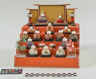 DescriptionSmall children's festival doll set with 15 dolls, including the Emperor & Empress dolls & other members of the imperial court; screen, two lanterns; two flower baskets; all pieces are attached to a five tier stage.Status